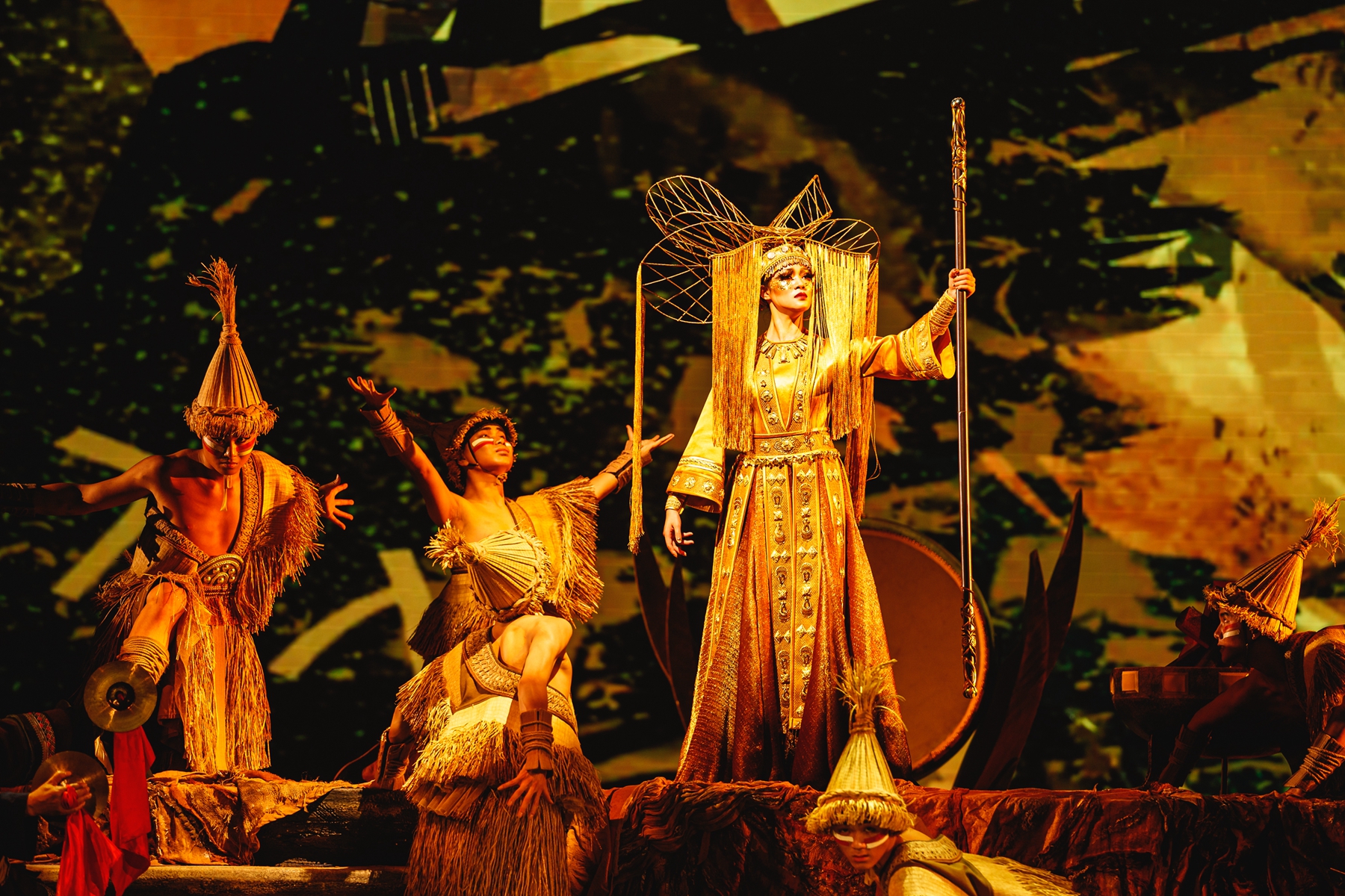 強(qiáng)勁的節(jié)奏在祠堂上空響起,赤裸上身、身著原始草裙的村民肅立成陣,跳起了土苗民族的茅古斯舞;舞臺中心的升降臺載著裝扮華麗神秘的女祭司慢慢升起,作為這場儀式的指揮,她的吟唱仿佛統(tǒng)領(lǐng)著整個森林山谷中的所有神力......